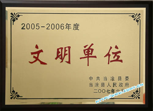 近日,我公司被中共當(dāng)涂縣委、當(dāng)涂縣人民政府聯(lián)合授予“當(dāng)涂縣2005-2006年度縣文明單位的”光榮稱號(hào),這標(biāo)志著我公司在制度化、規(guī)范化、科學(xué)化管理方面邁上了一個(gè)新的臺(tái)階。近年來(lái),我公司穩(wěn)抓精神文明建設(shè),努力為員工、社會(huì)營(yíng)造健康、和諧的工作、生活環(huán)境,做到了物質(zhì)文明和精神文明建設(shè)雙豐收、雙促進(jìn)。