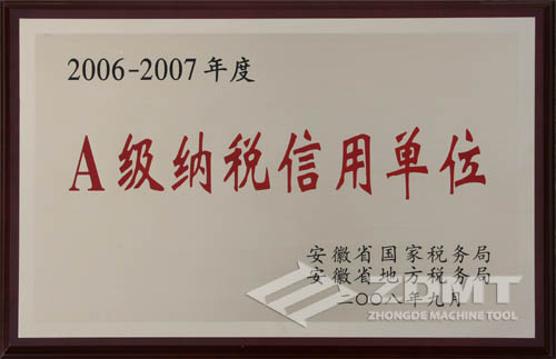 近日,安徽省國家稅務(wù)局、地方稅務(wù)局聯(lián)合表彰了2006-2007年度納稅信用等級(jí)A級(jí)納稅人,中德機(jī)床也再次被授予了“A級(jí)納稅信用單位”的證書。