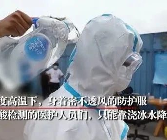 6月以來,北京市接連爆發新冠肺炎確診病例,各個社區的檢測防控工作高度緊張,奮戰在抗疫一線的醫護人員穿著厚重的防護服,在戶外烈日下連續做著核酸檢測工作。高溫加上高強度的工作很是難熬,但是檢測工作不能耽誤,更是有人用腳踩冰塊,冰水澆頭來進行降溫,讓人看了很是心疼。